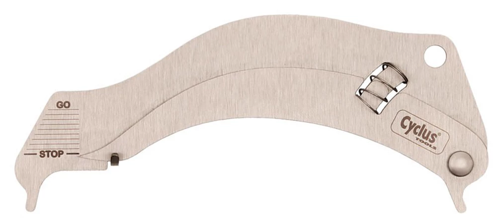 Avec la jauge d’usure de chaîne CYCLUS TOOLS, il est possible de déterminer le bon moment pour changer la chaîne. Le degré d’usure est indiqué par une échelle. La mesure s’effectue par les languettes intérieures et assure ainsi un résultat de mesure précis.