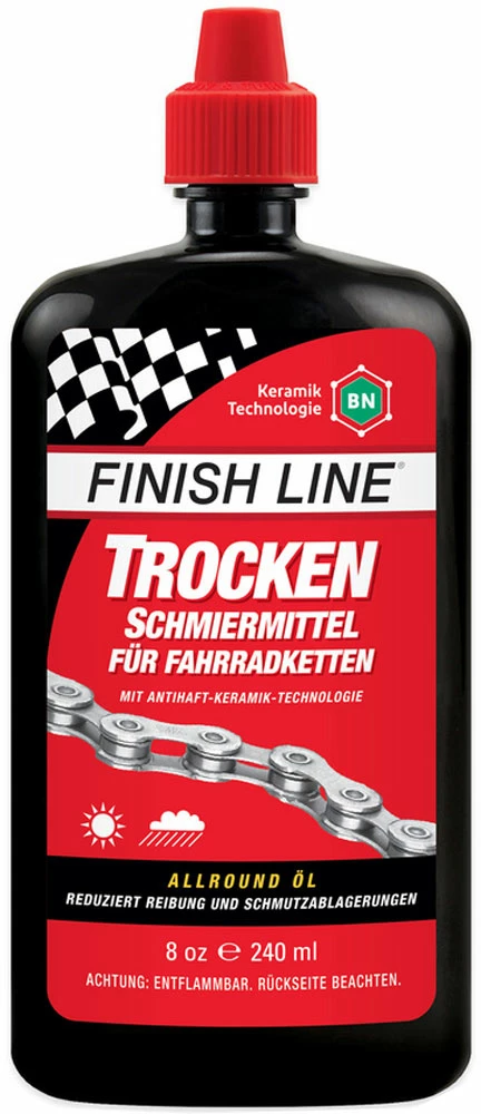 Le lubrifiant sec est particulièrement recommandé pour une utilisation sur route ou hors route dans des environnements secs, sales et poussiéreux, mais il donne également de bons résultats dans des conditions modérément humides. Il peut également être utilisé sur les dérailleurs, les manettes et les câbles. Le Finish Line Dry Lube assure une efficacité optimale de la transmission sans attirer des quantités excessives de saleté.