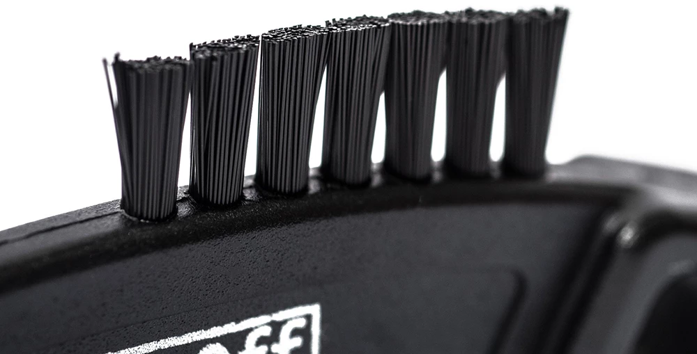 - est idéal pour atteindre les saletés difficiles à déloger sur les pignons, les moyeux et autres endroits étroits comme les supports de suspension ou les couronnes de fourche. Ce tout nouveau design est doté d’un manche robuste et résistant aux chocs qui ne glisse pas dans des conditions extrêmes, de poils en nylon durables et de zones d’impact caoutchoutées pour une protection maximale des finitions délicates.