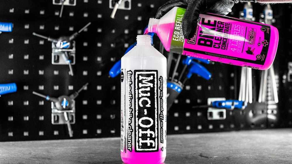 - Remplissez une bouteille de 1 litre de Muc-Off Bike Cleaner avec 750ml d’eau avant d’ajouter 250ml de Bike Cleaner Concentrate