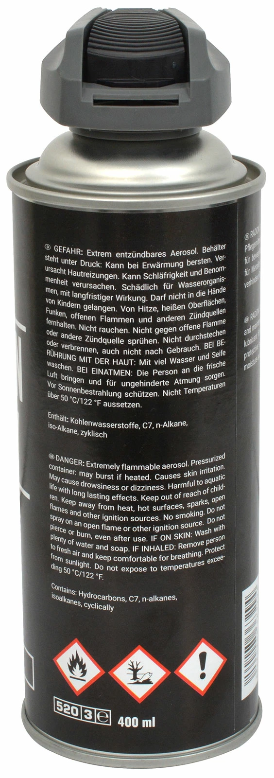 Aérosol extrêmement inflammable. Le récipient est sous pression : peut éclater en cas d’échauffement. Provoque une irritation de la peau. Peut provoquer somnolence et vertiges. Nocif pour les organismes aquatiques, entraîne des effets néfastes à long terme. L’exposition répétée peut provoquer dessèchement ou gerçures de la peau. Tenir hors de portée des enfants. Tenir à l’écart de la chaleur, des surfaces chaudes, des étincelles, des flammes nues et de toute autre source d’inflammation. Ne pas fumer. Ne pas percer ou brûler, même après utilisation. EN CAS DE CONTACT AVEC LA PEAU : Laver abondamment à l’eau et au savon. EN CAS D’INHALATION : Transporter la personne à l’air frais et lui permettre de respirer librement. Protéger des rayons du soleil. Ne pas exposer à des températures supérieures à 50 °C/122 °F